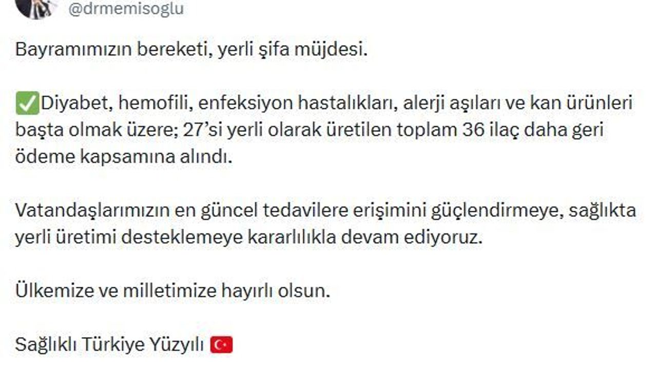 Sağlık Bakanı Kemal Memişoğlu, sanal medya hesabından yaptığı açıklamada, 'Bayramımızın bereketi, yerli şifa müjdesi. Diyabet, hemofili, enfeksiyon hastalıkları, alerji aşıları ve kan ürünleri başta olmak üzere; 27'si yerli olarak üretilen toplam 36 ilaç daha geri ödeme kapsamına alındı. Vatandaşlarımızın en güncel tedavilere erişimini güçlendirmeye, sağlıkta yerli üretimi desteklemeye kararlılıkla devam ediyoruz. Ülkemize ve milletimize hayırlı olsun' ifadelerini kullandı. (DHA)