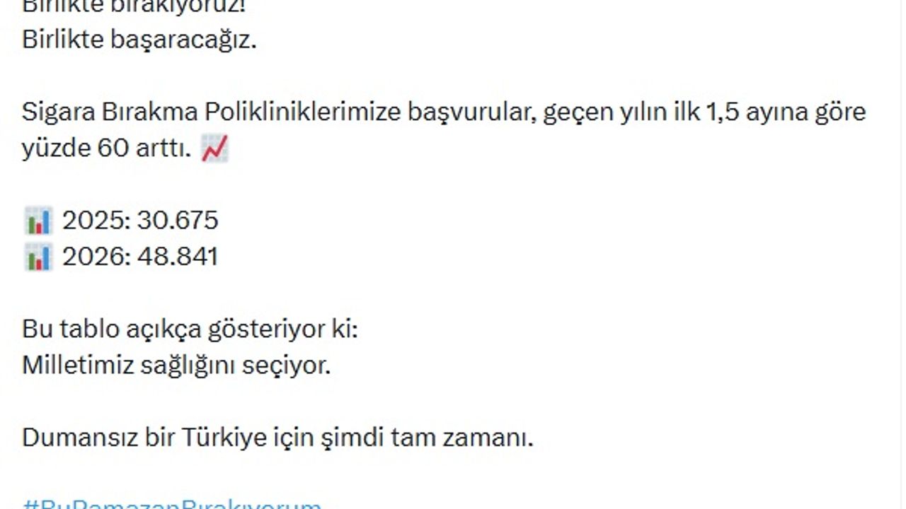 Sağlık Bakanı Kemal Memişoğlu, sanal medya hesabından 'Birlikte bırakıyoruz! Birlikte başaracağız' başlığı ile Türkiye'de Sigara Bırakma Polikliniklerine yapılan başvuruların, geçen yılın ilk 1,5 ayına göre yüzde 60 arttığını açıkladı. Memişoğlu paylaşımında, 2025 yılında 30 bin 675 başvuru, 2026 yılında 48 bin 841 başvuru yapıldığını belirterek, 'Bu tablo açıkça gösteriyor ki, milletimiz sağlığını seçiyor. Dumansız bir Türkiye için şimdi tam zamanı' ifadelerini kullandı. (DHA)