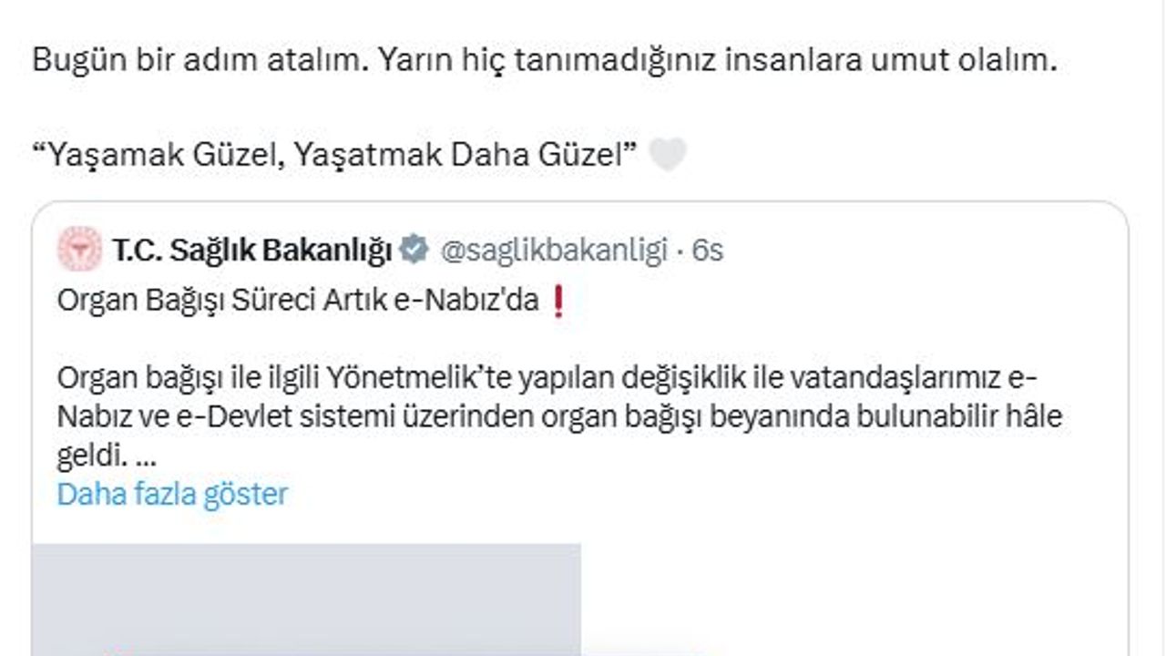Sağlık Bakanı Kemal Memişoğlu, sosyal medya hesabından yaptığı paylaşımda, "’Her Bağış Yeni Bir Hayattır' diyerek organ bağışı sürecini çok daha kolay hale getirdik. Vatandaşlarımız artık hem e-Nabız hem de e-Devlet üzerinden organ bağışı vasiyetinde bulunabiliyor. Sizleri başka hayatlara dokunmak için organ bağışı yapmaya davet ediyorum. Bugün bir adım atalım. Yarın hiç tanımadığınız insanlara umut olalım. 'Yaşamak Güzel, Yaşatmak Daha Güzel'" ifadelerini kullandı. (DHA)