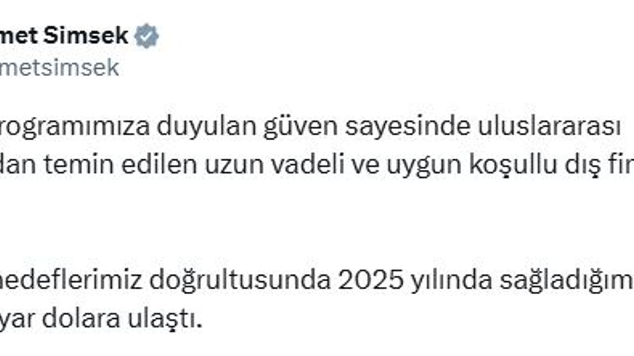 Hazine ve Maliye Bakanı Mehmet Şimşek, sosyal medya hesabından yaptığı açıklamada, "Ekonomi programımıza duyulan güven sayesinde uluslararası kuruluşlardan temin edilen uzun vadeli ve uygun koşullu dış finansman artıyor. Kalkınma hedeflerimiz doğrultusunda 2025 yılında sağladığımız kaynak tutarı 7 milyar dolara ulaştı" dedi. (DHA)