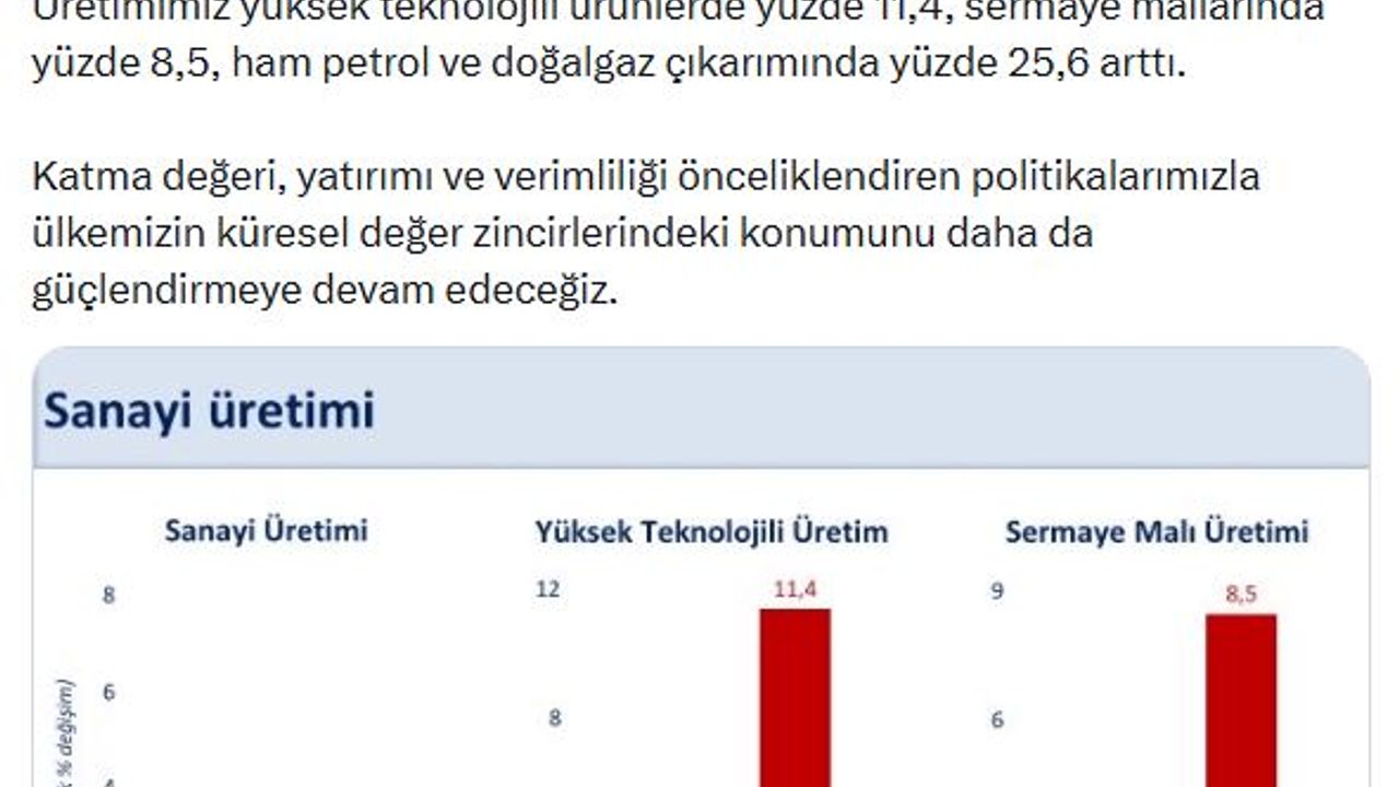 Hazine ve Maliye Bakanı Mehmet Şimşek, sanayi üretimi istatistiklerine ilişkin sanal medya hesabından yaptığı açıklamada, 'Katma değerli üretimi ve potansiyel büyümeyi güçlendiren, enerjide dışa bağımlılığı azaltan politikalarımızın sonuçlarını almaya devam ediyoruz. 2025 yılında sanayi üretiminde yıllık yüzde 2,6 artış gerçekleşti. Üretimimiz yüksek teknolojili ürünlerde yüzde 11,4, sermaye mallarında yüzde 8,5, ham petrol ve doğal gaz çıkarımında yüzde 25,6 arttı. Katma değeri, yatırımı ve verimliliği önceliklendiren politikalarımızla ülkemizin küresel değer zincirlerindeki konumunu daha da güçlendirmeye devam edeceğiz' dedi. (DHA)