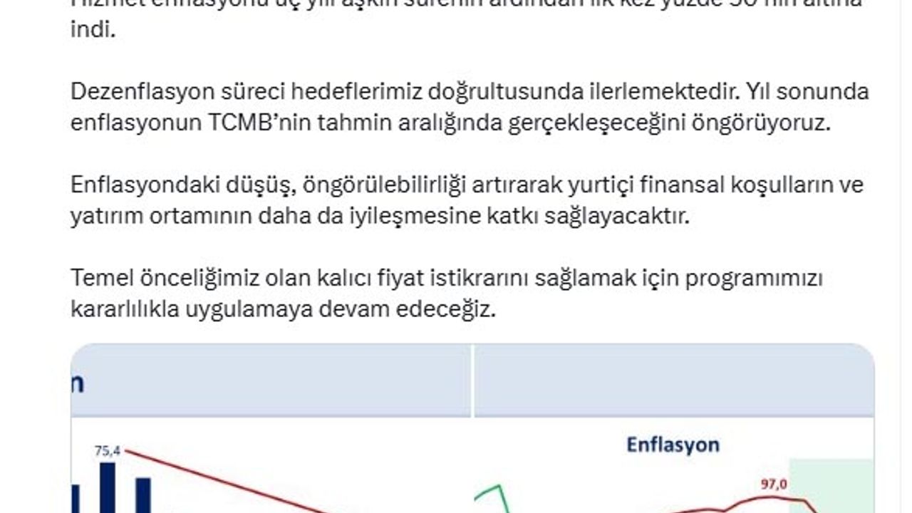 Bakan Şimşek, sosyal medya hesabından açıklama yaptı. Şimşek, "Enflasyon 44 ayın en düşük seviyesinde. Aylık enflasyon temmuzda geçici ve dönemsel etkilerle yüzde 2,06 gerçekleşirken yıllık enflasyon son 12 ayda 28,3 puan düşüşle yüzde 33,5’e geriledi. Yıllık gıda enflasyonu yüzde 28, temel mal enflasyonu yüzde 20,7 oldu. Hizmet enflasyonu 3 yılı aşkın sürenin ardından ilk kez yüzde 50’nin altına indi. Dezenflasyon süreci hedeflerimiz doğrultusunda ilerlemektedir. Yıl sonunda enflasyonun TCMB’nin tahmin aralığında gerçekleşeceğini öngörüyoruz. Enflasyondaki düşüş, öngörülebilirliği artırarak yurtiçi finansal koşulların ve yatırım ortamının daha da iyileşmesine katkı sağlayacaktır. Temel önceliğimiz olan kalıcı fiyat istikrarını sağlamak için programımızı kararlılıkla uygulamaya devam edeceğiz" ifadelerini kullandı.