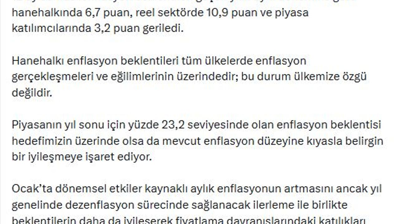 ANKARA, (DHA)- HAZİNE ve Maliye Bakanı Mehmet Şimşek, piyasa katılımcılarının enflasyon beklentilerine ilişkin, 'Ocakta dönemsel etkiler kaynaklı aylık enflasyonun artmasını, ancak yıl genelinde dezenflasyon sürecinde sağlanacak ilerleme ile birlikte beklentilerin daha da iyileşerek, fiyatlama davranışlarındaki katılıkları azaltmasını ve enflasyondaki düşüşe daha güçlü katkı sağlamasını bekliyoruz' dedi.