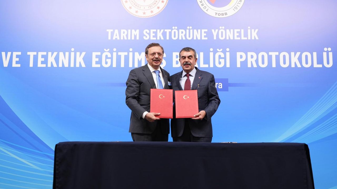 TOBB Başkanı Rifat Hisarcıklıoğlu ise tarım sektöründe, modern tarım tekniklerini bilen, gıda teknolojileri ve laboratuvar uygulamalarına hakim, hayvancılıkta bakım ve sağlığı profesyonelce yürütebilen tekniker ve teknisyenlere büyük ihtiyaç olduğunu vurgulayarak, "Bir tarafta üretimin teknolojik dönüşümü hızlanırken, diğer tarafta sahada uygulayacak, bakımını yapacak ve yenilikleri uygulamaya koyacak ara eleman açığı devam etmektedir. Bu boşluk, verimlilik, kalite ve rekabet gücümüzü doğrudan etkiliyor, gençlerimiz için sürdürülebilir istihdam fırsatlarının önünde bir bariyer oluşturuyor. İşte tam da bu nedenlerle bu protokolün önemi büyüktür. Milli Eğitim Bakanlığımız ile TOBB arasında bugün imzalanacak olan bu iş birliğiyle, çeşitli illerde tarım alanındaki 30 meslek lisesini Ticaret Borsalarımız ile Ticaret ve Sanayi Odalarımızla eşleştireceğiz. Tarım meslek liselerimiz, öğrencilere hem teorik bilgiyi hem de gerçek üretim ortamlarında uygulamalı deneyimi verecek. Dolayısıyla mezun olduklarında doğrudan üretim süreçlerine katılabilecek, işletmelerin aradığı nitelikte elemanlar haline gelecekler" dedi.