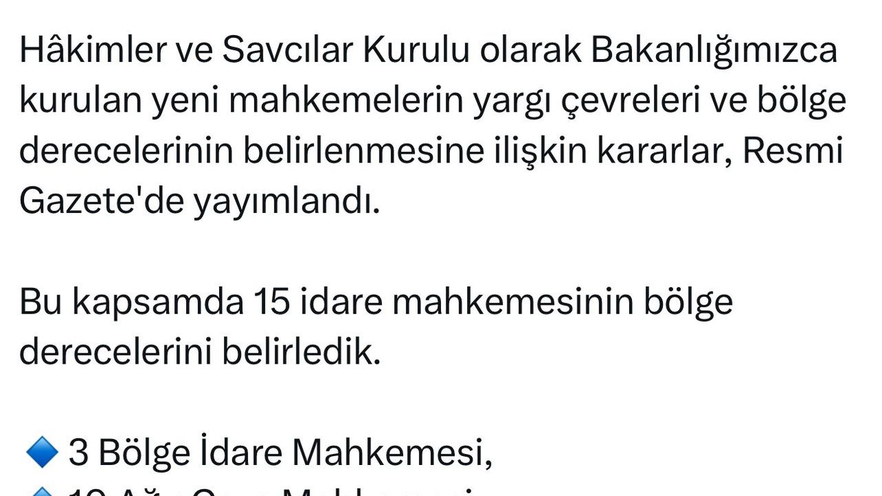 Adalet Bakanı Yılmaz Tunç, sosyal medya hesabından yaptığı paylaşımda, "Yargının etkinliğini artırmak, mahkemelerde ihtisaslaşmayı sağlamak ve vatandaşlarımızın adalet hizmetlerimize erişimini daha da kolaylaştırmak amacıyla çalışmalarımızı kararlılıkla sürdürüyoruz. Hakimler ve Savcılar Kurulu olarak Bakanlığımızca kurulan yeni mahkemelerin yargı çevreleri ve bölge derecelerinin belirlenmesine ilişkin kararlar, Resmi Gazete'de yayımlandı. Bu kapsamda 15 idare mahkemesinin bölge derecelerini belirledik. 3 bölge idare mahkemesi, 10 ağır ceza mahkemesi, 10 infaz hakimliği, 2 çocuk ağır ceza mahkemesi, 28 aile mahkemesi, 1 ticaret mahkemesi, 5 iş mahkemesi, 2 tüketici mahkemesi, 2 fikri ve sınai haklar hukuk mahkemesinin yargı çevrelerini düzenledik. Armutlu, Çiçekdağı, Harmancık, İnönü ilçelerimiz, il sınırları dışında başka bir yargı çevresine bağlı olmaktan çıkarılarak, bu ilçelerimizde yeni mahkeme teşkilatı kurduk. Hukukun üstünlüğünü esas alan, gecikmeyen ve öngörülebilir bir adalet sistemi vizyonuyla çalışmalarımıza kesintisiz devam edeceğiz. Yaptığımız düzenlemelerin yargı camiamız, ülkemiz ve milletimiz için hayırlara vesile olmasını diliyorum" ifadelerini kullandı. (DHA)