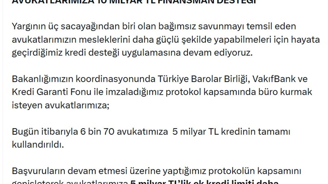 Bakan Tunç, sanal medya hesabından yaptığı açıklamada, 'Yargının üç sacayağından biri olan bağımsız savunmayı temsil eden avukatlarımızın mesleklerini daha güçlü şekilde yapabilmeleri için hayata geçirdiğimiz kredi desteği uygulamasına devam ediyoruz. Bakanlığımızın koordinasyonunda Türkiye Barolar Birliği, Vakıf Bank ve Kredi Garanti Fonu ile imzaladığımız protokol kapsamında büro kurmak isteyen avukatlarımıza; bugün itibarıyla 6 bin 70 avukatımıza 5 milyar TL kredinin tamamı kullandırıldı. Başvuruların devam etmesi üzerine yaptığımız protokolün kapsamını genişleterek avukatlarımıza 5 milyar TL'lik ek kredi limiti daha sağlayacağız. Protokolümüzün süresini de 30 Haziran 2026 tarihine kadar uzattık. Bu kapsamda avukatlarımıza; 1 milyon TL'ye kadar, 6 ay geri ödemesiz, 36 ay vadeli ödeme kolaylığıyla kredi imkanı sunuyoruz. Avukatlarımızın görevlerini en iyi imkanlarla yapabilmelerini sağlamak için bağımsız savunmayı güçlendirecek adımlar atmaya devam edeceğiz' ifadelerini kullandı. (DHA)