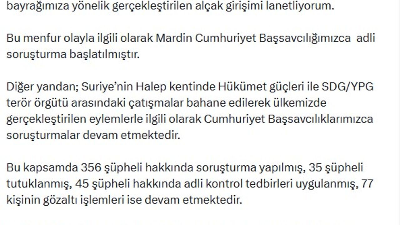 Tunç, Suriye'nin Halep kentinde hükümet güçleri ile SDG/YPG terör örgütü arasındaki çatışmalar bahane edilerek Türkiye'de gerçekleştirilen eylemlerle ilgili de soruşturmaların devam ettiğini bildirerek, 'Bu kapsamda 356 şüpheli hakkında soruşturma yapılmış, 35 şüpheli tutuklanmış, 45 şüpheli hakkında adli kontrol tedbirleri uygulanmış, 77 kişinin gözaltı işlemleri ise devam etmektedir. Devletimizin egemenliğine ve toplumsal huzurumuza yönelen hiçbir saldırı, hiçbir provokasyon cezasız kalmayacaktır' ifadelerini kullandı. (DHA)