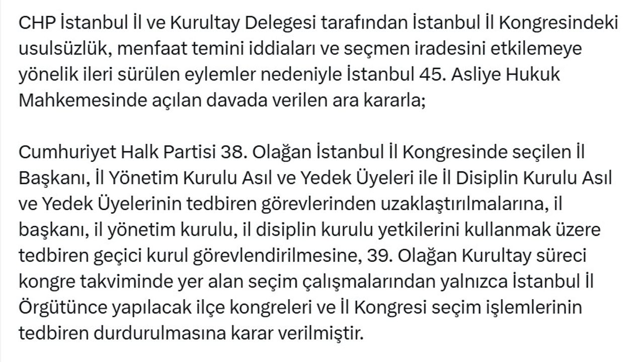 “CHP İstanbul İl ve Kurultay Delegesi tarafından İstanbul İl Kongresindeki usulsüzlük, menfaat temini iddiaları ve seçmen iradesini etkilemeye yönelik ileri sürülen eylemler nedeniyle İstanbul 45’inci Asliye Hukuk Mahkemesinde açılan davada verilen ara kararla; Cumhuriyet Halk Partisi 38’inci Olağan İstanbul İl Kongresinde seçilen İl Başkanı, İl Yönetim Kurulu Asıl ve Yedek Üyeleri ile İl Disiplin Kurulu Asıl ve Yedek Üyelerinin tedbiren görevlerinden uzaklaştırılmalarına, il başkanı, il yönetim kurulu, il disiplin kurulu yetkilerini kullanmak üzere tedbiren geçici kurul görevlendirilmesine, 39’uncu Olağan Kurultay süreci kongre takviminde yer alan seçim çalışmalarından yalnızca İstanbul İl Örgütünce yapılacak ilçe kongreleri ve İl Kongresi seçim işlemlerinin tedbiren durdurulmasına karar verilmiştir. Cumhuriyet Halk Partisi 38’inci Olağan İstanbul İl Kongresi delegelerinin tedbiren görevden alınmaları talebi ve İstanbul İl Kongresinde alınan tüm kararların hükümlerinin tedbiren durdurulması talepleri reddedilmiştir. Mahkeme tarafından kabul edilen kararlar yönünden HMK 394. Maddesine göre itiraz yolu açık olup, kararın reddedilen kısımlarına yönelik HMK 391. Maddesi uyarınca İstanbul Bölge Adliye Mahkemesine istinaf yasa yolu açık olmak üzere karar verilmiştir. Mahkeme tarafından verilen ara karar, yargılama süreci boyunca doğabilecek telafisi güç zararların önlenmesine yönelik ihtiyati tedbir niteliğinde olup, nihai bir hüküm teşkil etmemektedir. Yargılama süreci devam etmektedir.” (DHA)