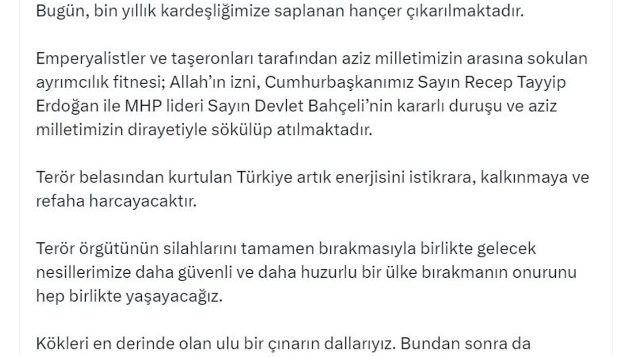 Bakan Tunç, sosyal medya hesabından yaptığı açıklamada, "Yıllardır ülkemizin huzurunun, birliğinin ve kalkınmasının önünde en büyük engel olan terör örgütünün silahlarını bırakarak yakması, 'Terörsüz Türkiye' idealimize giden yolda en önemli adımlardan biridir. Bugün, bin yıllık kardeşliğimize saplanan hançer çıkarılmaktadır. Emperyalistler ve taşeronları tarafından aziz milletimizin arasına sokulan ayrımcılık fitnesi; Allah'ın izni, Cumhurbaşkanımız Sayın Recep Tayyip Erdoğan ile MHP lideri Sayın Devlet Bahçeli’nin kararlı duruşu ve aziz milletimizin dirayetiyle sökülüp atılmaktadır. Terör belasından kurtulan Türkiye artık enerjisini istikrara, kalkınmaya ve refaha harcayacaktır. Terör örgütünün silahlarını tamamen bırakmasıyla birlikte gelecek nesillerimize daha güvenli ve daha huzurlu bir ülke bırakmanın onurunu hep birlikte yaşayacağız" dedi.