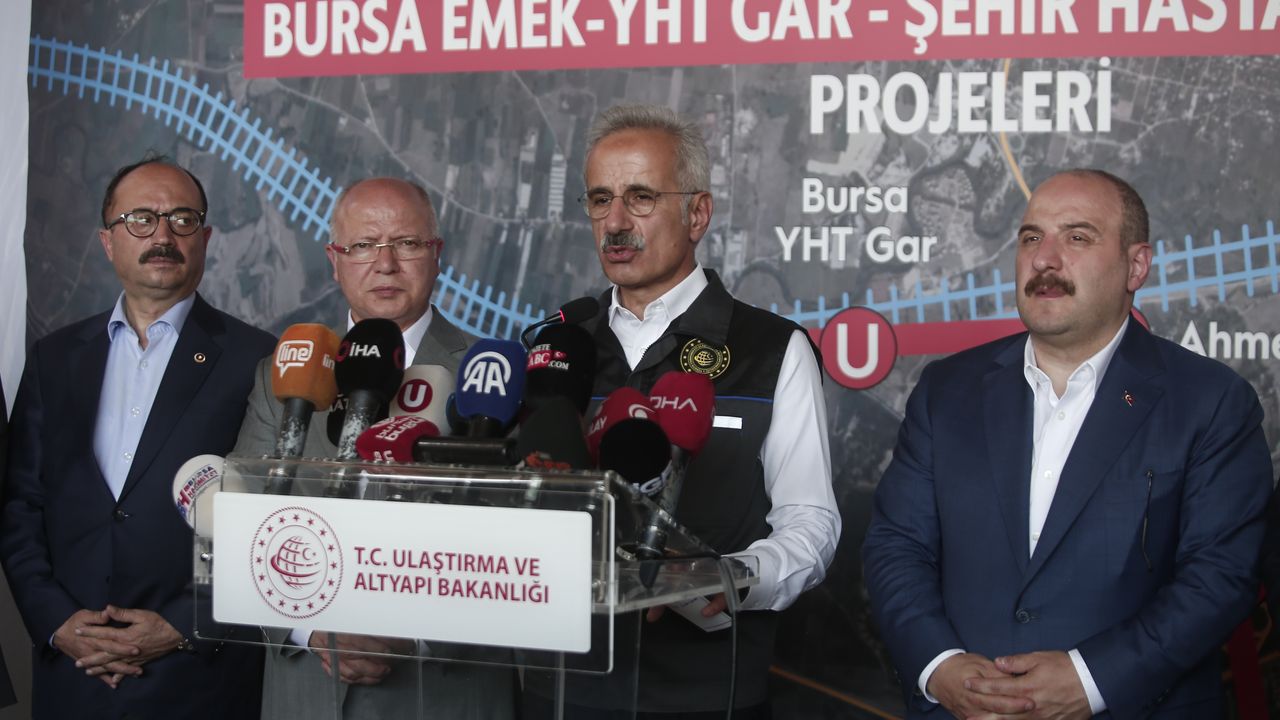 Gazetecilere yaptığı açıklamada, Bursa için hafif raylı sistem ile ilgili gerekli tespitleri yaptıklarının altını çizen Bakan Uraloğlu, “Bizim Bursa Uludağ Üniversitesi ile depo sahası arasında yaklaşık 1200 metrelik bir alan vardı. Burayı projeye sonradan ilave ettik. Bunu üniversite ile depo arasında bağlantıyı sağlamış oldu. Yine aynı şekilde devam eden Emek-Şehir Hastanesi arasındaki yaklaşık 4 bin 900 metrelik hatta da çalışmalar devam ediyoruz. Buradaki çalışmaları da inşallah 2026 sonuna kadar bitirmeyi istiyoruz. Ama bu hafif raylı sistem ve metronun bulunduğumuz Yüksek Hızlı Tren Gar İstasyonu'na kadar olan bölümü, yine yılın ilk yarısında veya ortalarında bitirerek bu entegrasyonu sağlamış olacağız. Yine burada bir kara yolu ve bağlantısını da araçlarıyla kullanacak olan vatandaşlarımız için Karayolları Genel Müdürlüğümüz ve Altyapı Yatırımları Genel Müdürlüğümüz ile planladık. İnşallah onun yapı sürecini de önümüzdeki günlerde başlamış olacağız” ifadelerini kullandı.