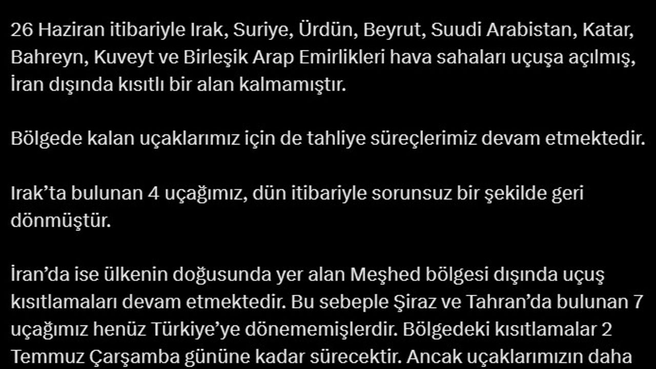 Bölgede kalan uçaklar için de tahliye süreçlerinin devam ettiğini kaydeden Uraloğlu, "Irak’ta bulunan 4 uçağımız, dün itibariyle sorunsuz bir şekilde geri dönmüştür. İran'da ise ülkenin doğusunda yer alan Meşhed bölgesi dışında uçuş kısıtlamaları devam etmektedir. Bu sebeple Şiraz ve Tahran'da bulunan 7 uçağımız henüz Türkiye'ye dönememişlerdir. Bölgedeki kısıtlamalar 2 Temmuz Çarşamba gününe kadar sürecektir. Ancak uçaklarımızın daha erken bir tarihte ülkemize dönebilmeleri için gerekli girişimlerde bulunuyoruz. Tüm seferlerimiz uygun şartlara göre yolcu ve ekip güvenlikleri gözetilerek planlanmaktadır" açıklamasında bulundu. (DHA)