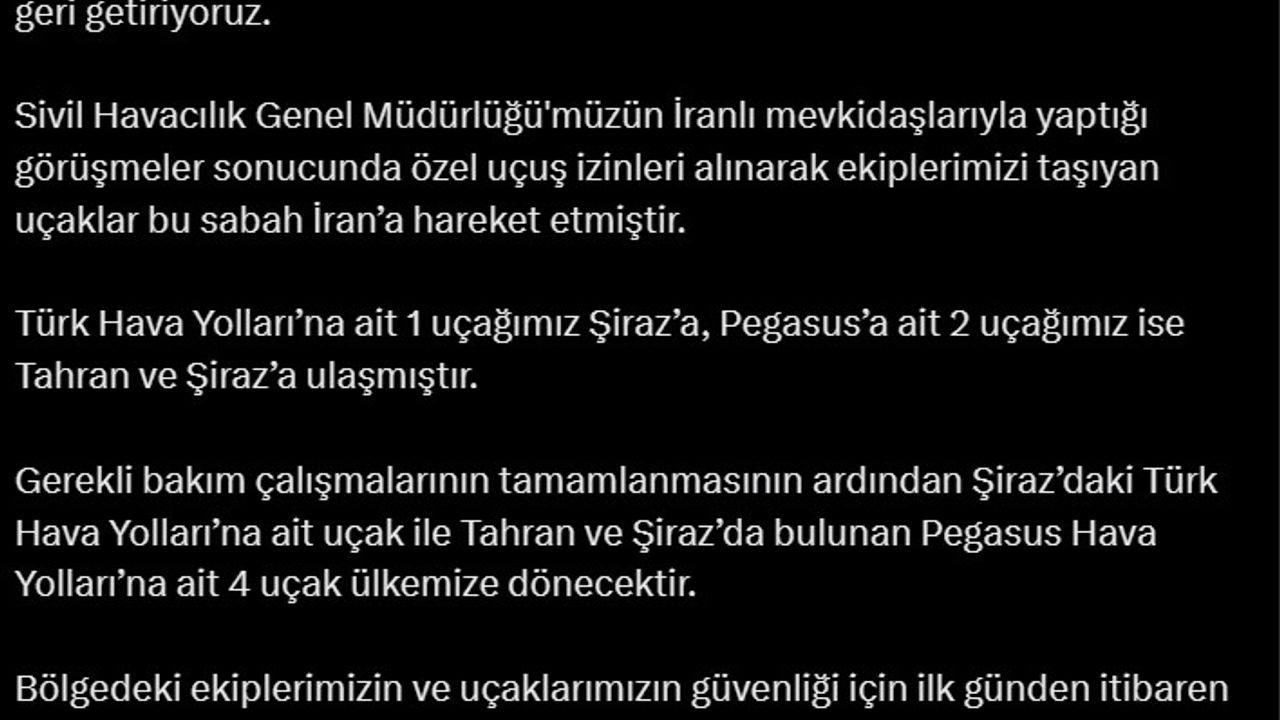 Bakan Uraloğlu, sosyal medya hesabından yaptığı açıklamada, "İran’da kalan uçaklarımızı Türkiye’ye geri getiriyoruz. Sivil Havacılık Genel Müdürlüğü'müzün İranlı mevkidaşlarıyla yaptığı görüşmeler sonucunda özel uçuş izinleri alınarak ekiplerimizi taşıyan uçaklar bu sabah İran’a hareket etmiştir. Türk Hava Yolları’na ait 1 uçağımız Şiraz’a, Pegasus’a ait 2 uçağımız ise Tahran ve Şiraz’a ulaşmıştır. Gerekli bakım çalışmalarının tamamlanmasının ardından Şiraz’daki Türk Hava Yolları’na ait uçak ile Tahran ve Şiraz’da bulunan Pegasus Hava Yolları’na ait 4 uçak ülkemize dönecektir. Bölgedeki ekiplerimizin ve uçaklarımızın güvenliği için ilk günden itibaren gelişmeleri yakından takip etmeyi sürdürüyoruz. Sürecin sağlıklı bir şekilde tamamlanması için İranlı yetkililer ile iletişimimizi de devam ettiriyoruz” ifadelerini kullandı. (DHA)