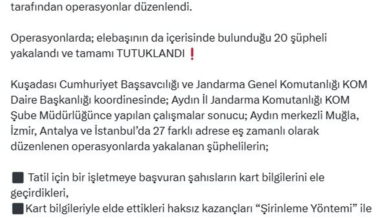 İçişleri Bakanı Ali Yerlikaya, jandarma tarafından Aydın merkezli 5 ilde dolandırıcı suç örgütüne yönelik düzenlenen operasyonu, sosyal medya hesabından paylaştı. Buna göre; hesaplarında 1,1 milyar TL işlem hacmi bulunan, elebaşılığını H.Ö.'nün yaptığı dolandırıcı organize suç örgütüne yönelik operasyonda 20 şüpheli yakalandı. Yapılan aramalarda, çok miktarda döviz ile çok sayıda cep telefonu, bellek ve tablet ele geçirildi. Ayrıca şüphelilere ait 484 banka hesabı ile toplam 201,5 milyon TL değerinde 16 taşınmaz, 1 şirket ve 14 araca el konuldu. Şüphelilerin tamamı sevk edildikleri hakimliklerce tutuklandı.