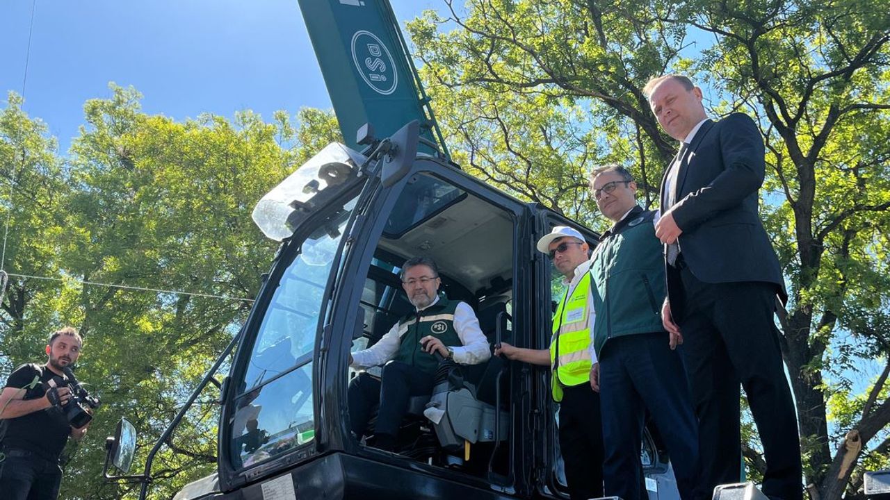 Bakan Yumaklı, konuşmasının ardından araçları inceleyerek, amfibik ekskavatör üzerinde basın mensuplarına poz verdi. (DHA)