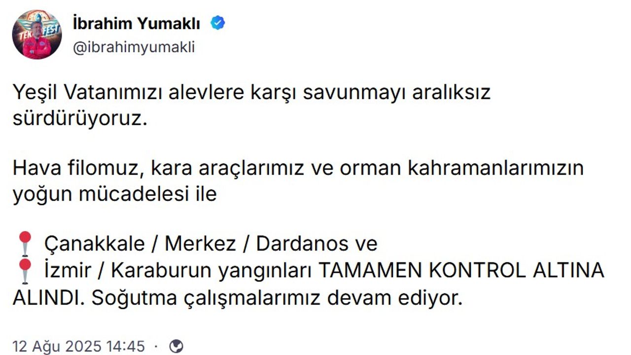 Tarım ve Orman Bakanı İbrahim Yumaklı, sosyal medya hesabından yaptığı açıklamada, "Yeşil vatanımızı alevlere karşı savunmayı aralıksız sürdürüyoruz. Hava filomuz, kara araçlarımız ve orman kahramanlarımızın yoğun mücadelesi ile Çanakkale merkez, Dardanos ve İzmir Karaburun yangınları tamamen kontrol altına alındı. Soğutma çalışmalarımız devam ediyor" dedi. (DHA)