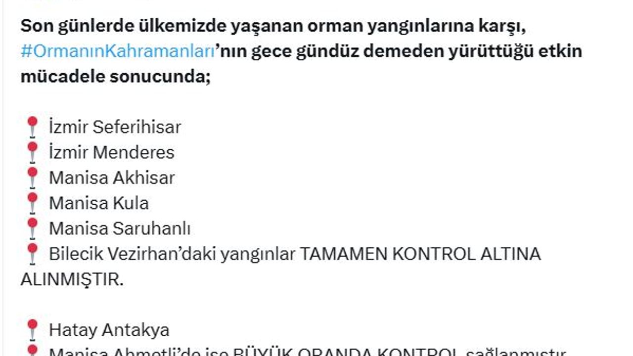 Tarım ve Orman Bakanı İbrahim Yumaklı, sosyal medya hesabından yaptığı açıklamada, "Son günlerde ülkemizde yaşanan orman yangınlarına karşı, ormanın kahramanlarının gece gündüz demeden yürüttüğü etkin mücadele sonucunda; İzmir Seferihisar, İzmir Menderes, Manisa Akhisar, Manisa Kula, Manisa Saruhanlı, Bilecik Vezirhan'daki yangınlar tamamen kontrol altına alınmıştır. Hatay Antakya, Manisa Ahmetli'de ise büyük oranda kontrol sağlanmıştır. Soğutma çalışmalarımız kararlılıkla devam etmektedir. Yangınlarla mücadelede başta kahraman ekip arkadaşlarımız ve orman yangın gönüllülerimiz olmak üzere, iş birliği içinde hareket eden tüm kamu kurumlarımıza, sivil toplum kuruluşlarına ve aziz milletimize gönülden teşekkür ediyorum" dedi.
