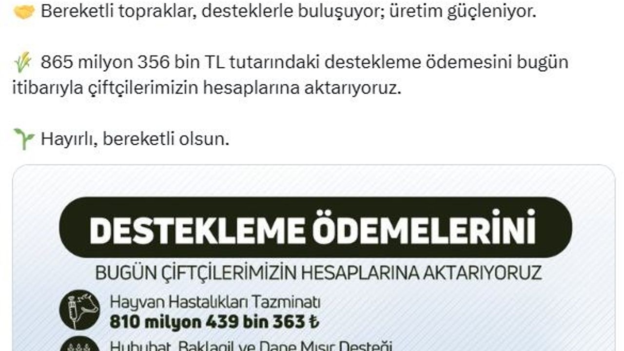 Bakan Yumaklı, sosyal medya hesabından yaptığı açıklamada, "Bereketli topraklar, desteklerle buluşuyor; üretim güçleniyor. 865 milyon 356 bin TL tutarındaki destekleme ödemesini bugün itibarıyla çiftçilerimizin hesaplarına aktarıyoruz. Hayırlı, bereketli olsun" dedi.