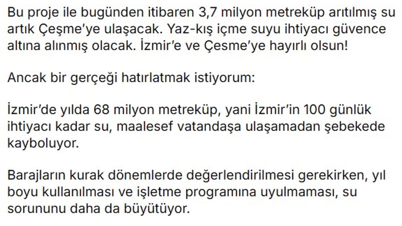 Yumaklı ayrıca "İzmir'de yılda 68 milyon metreküp, yani İzmir’in 100 günlük ihtiyacı kadar su, maalesef vatandaşa ulaşamadan şebekede kayboluyor. Barajların kurak dönemlerde değerlendirilmesi gerekirken, yıl boyu kullanılması ve işletme programına uyulmaması, su sorununu daha da büyütüyor. Unutmayalım, her damla geleceğimizdir. Tüm belediyelerimizi, kayıp-kaçak oranlarını en aza indirmek için gerekli yatırımları yapmaya, su kaynaklarını doğru kullanarak işletme programlarına uymaya davet ediyorum. Suyumuzu korumak artık bir tercih değil, gelecek nesillerimiz için bir zorunluluktur" açıklamasında bulundu. (DHA)