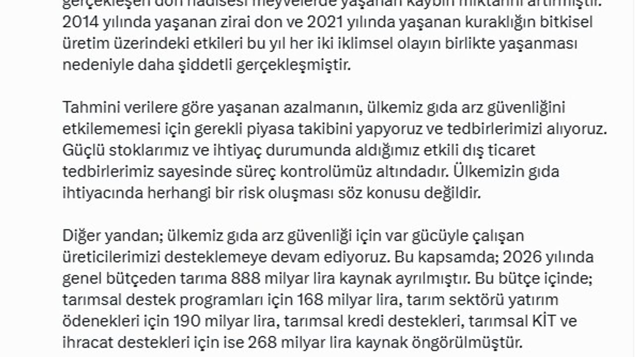 Yumaklı, diğer yandan ülkenin gıda arz güvenliği için var gücüyle çalışan üreticileri desteklemeye devam ettiklerini vurgulayarak, "Bu kapsamda; 2026 yılında genel bütçeden tarıma 888 milyar lira kaynak ayrılmıştır. Bu bütçe içinde; tarımsal destek programları için 168 milyar lira, tarım sektörü yatırım ödenekleri için 190 milyar lira, tarımsal kredi destekleri, tarımsal KİT ve ihracat destekleri için ise 268 milyar lira kaynak öngörülmüştür. Ayrıca, zirai don zararlarından etkilenen üreticilerimize toplam 46,5 milyar TL ödeme yapacağız. Bu kapsamda; tarım sigortası olan üreticilerimize 23 milyar TL hasar tazminatının ödenmesine devam ediyoruz. Şu ana kadar toplam 19 milyar TL hasar tazminatını ödedik. Tarım sigortası bulunmayan ancak Çiftçi Kayıt Sistemi'ne (ÇKS) kayıtlı üreticilerimize ise toplam 23,5 milyar TL destekleme ödemesi yapacağız. Bu rakamın da 13,4 milyar TL’sini ödedik, kalan 10,1 milyar TL’yi önümüzdeki günlerde ödeyeceğiz. Bugün açıklanan veriler üzerinden, ülkemiz gıda ihtiyacının karşılanmasına dönük maksatlı yorum ve haberlere vatandaşlarımızın itibar etmemesini rica ederiz. Tarımsal üretimimiz ve gıda arz güvenliğine dönük aldığımız tedbirlerle, vatandaşlarımızın gıda ihtiyacı sorunsuz şekilde karşılanmaya devam edecektir" ifadelerine yer verdi. (DHA)
