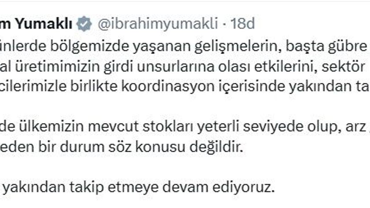 Bakan Yumaklı, sanal medya hesabından yaptığı açıklamada, 'Son günlerde bölgemizde yaşanan gelişmelerin, başta gübre olmak üzere tarımsal üretimimizin girdi unsurlarına olası etkilerini, sektör temsilcilerimizle birlikte koordinasyon içerisinde yakından takip ediyoruz. Gübrede ülkemizin mevcut stokları yeterli seviyede olup, arz güvenliğini tehdit eden bir durum söz konusu değildir. Süreci yakından takip etmeye devam ediyoruz' dedi. (DHA)