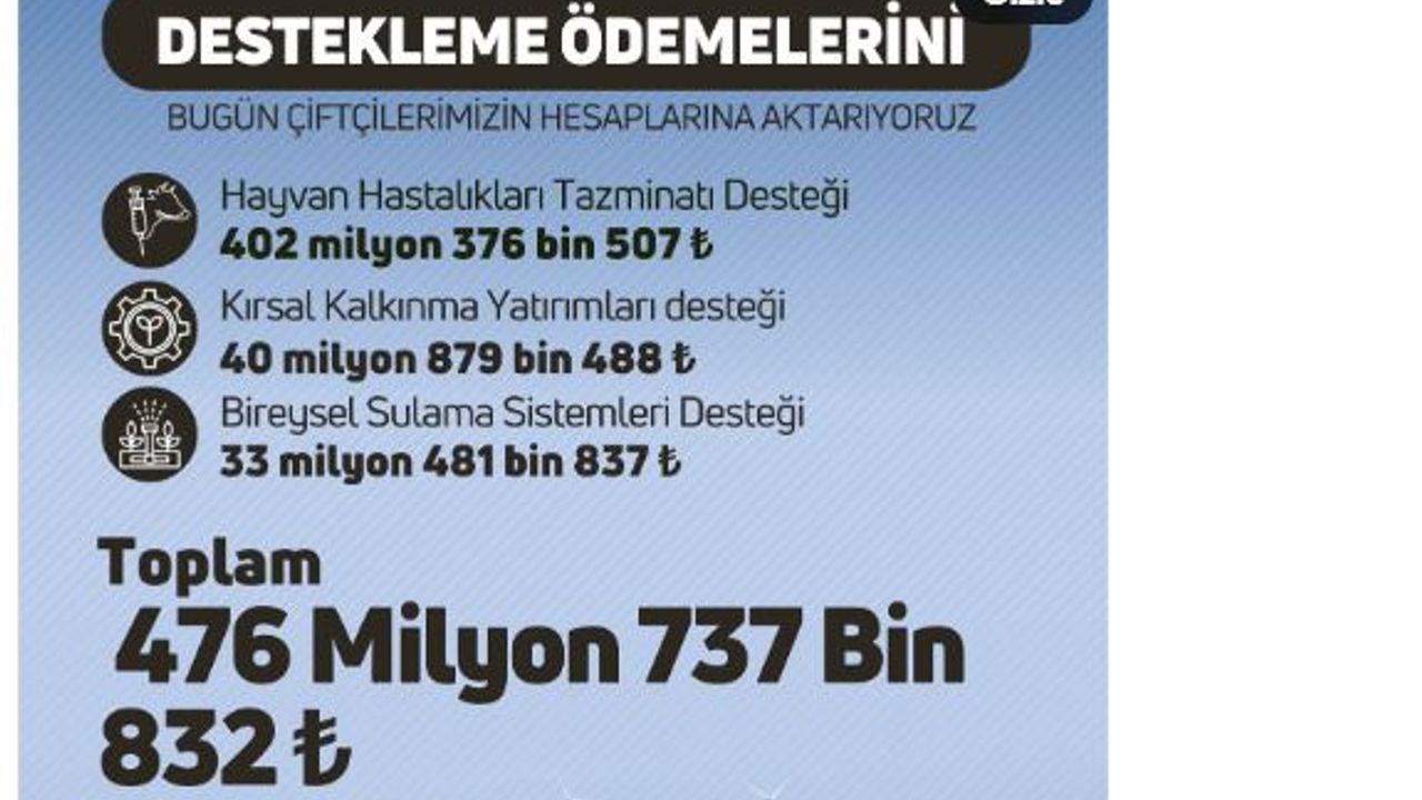 ANKARA, (DHA)- TARIM ve Orman Bakanı İbrahim Yumaklı, 476 milyon 737 bin TL tutarındaki tarımsal destek ödemesinin bugün itibarıyla çiftçilerin hesaplarına aktarıldığını açıkladı.
