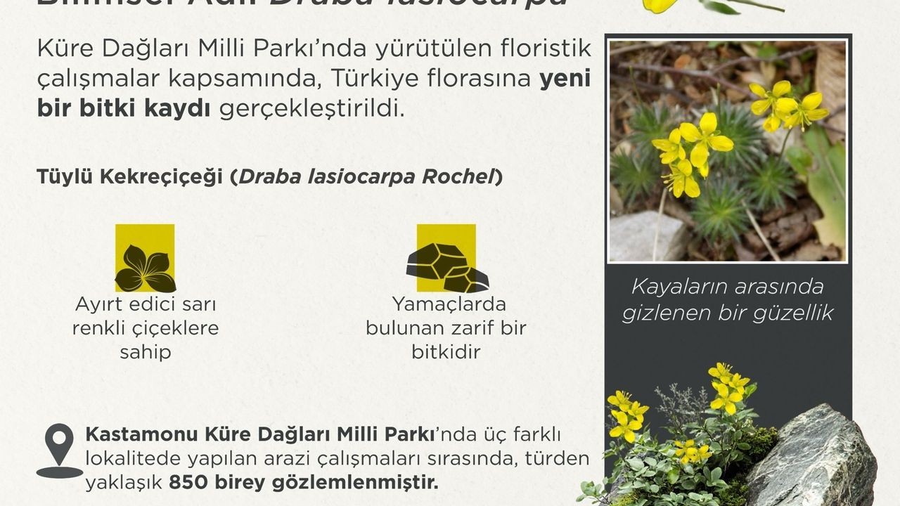 Mikail KARAMAN/ANKARA, (DHA)- TARIM ve Orman Bakanı İbrahim Yumaklı, Küre Dağları Milli Parkı’nda yürütülen floristik çalışmalar kapsamında keşfedilen 'Tüylü Kekreçiçeği'nin Türkiye florasına kaydedildiğini duyurdu.