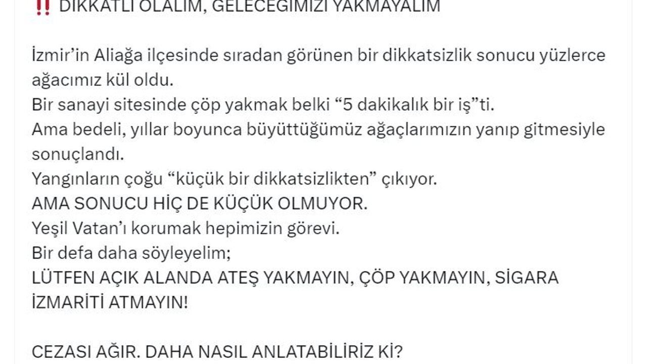 ANKARA, (DHA)- TARIM ve Orman Bakanı İbrahim Yumaklı, İzmir'in Aliağa ilçesinde dikkatsizlik sonucu çıkan yangında yüzlerce ağacın kül olduğunu belirterek, "Lütfen açık alanda ateş yakmayın, çöp yakmayın, sigara izmariti atmayın. Cezası ağır. Daha nasıl anlatabiliriz ki? Doğaya verdiğimiz zarar yarınımıza, geleceğimize verilmiş bir zarardır" dedi.