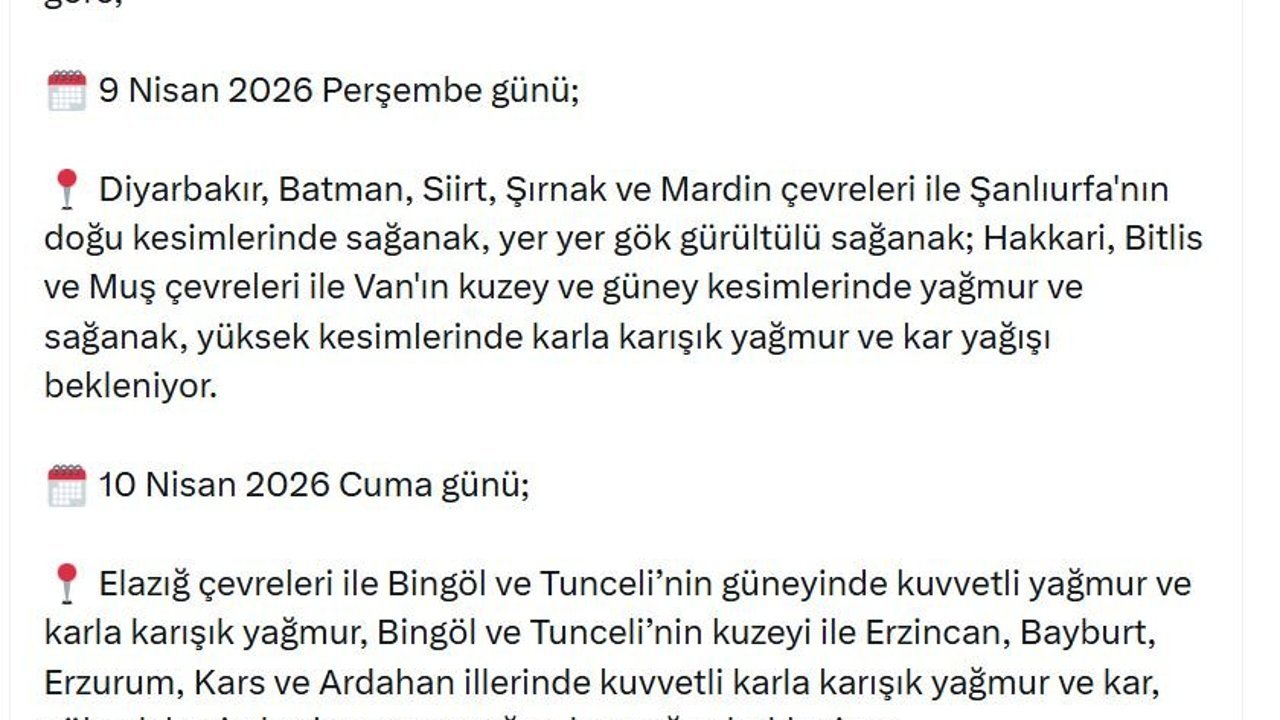Bakanlığın sanal medya hesabından yapılan açıklamada, 'Meteoroloji Genel Müdürlüğü'nde alınan son bilgilere göre; 9 Nisan 2026 Perşembe günü; Diyarbakır, Batman, Siirt, Şırnak ve Mardin çevreleri ile Şanlıurfa'nın doğu kesimlerinde sağanak, yer yer gök gürültülü sağanak; Hakkari, Bitlis ve Muş çevreleri ile Van'ın kuzey ve güney kesimlerinde yağmur ve sağanak, yüksek kesimlerinde karla karışık yağmur ve kar yağışı bekleniyor. 10 Nisan 2026 Cuma günü; Elazığ çevreleri ile Bingöl ve Tunceli'nin güneyinde kuvvetli yağmur ve karla karışık yağmur, Bingöl ve Tunceli'nin kuzeyi ile Erzincan, Bayburt, Erzurum, Kars ve Ardahan illerinde kuvvetli karla karışık yağmur ve kar, yüksek kesimlerde yer yer yoğun kar yağışı bekleniyor. Osmaniye çevreleri ile Hatay'ın kıyı kesimleri ve Adana'nın doğusunda yerel kuvvetli sağanak ve gök gürültülü sağanak yağış bekleniyor' denildi.