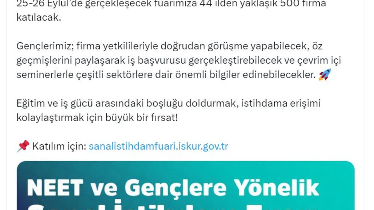 Bakan Işıkhan, sosyal medya hesabından yaptığı açıklamada, "Kariyerine yön vermek isteyen tüm gençlerimizi NEET ve Gençlere Yönelik Sanal İstihdam Fuarı'mıza bekliyoruz. 25-26 Eylül’de gerçekleşecek fuarımıza 44 ilden yaklaşık 500 firma katılacak. Gençlerimiz; firma yetkilileriyle doğrudan görüşme yapabilecek, öz geçmişlerini paylaşarak iş başvurusu gerçekleştirebilecek ve çevrim içi seminerlerle çeşitli sektörlere dair önemli bilgiler edinebilecekler. Eğitim ve iş gücü arasındaki boşluğu doldurmak, istihdama erişimi kolaylaştırmak için büyük bir fırsat" dedi.