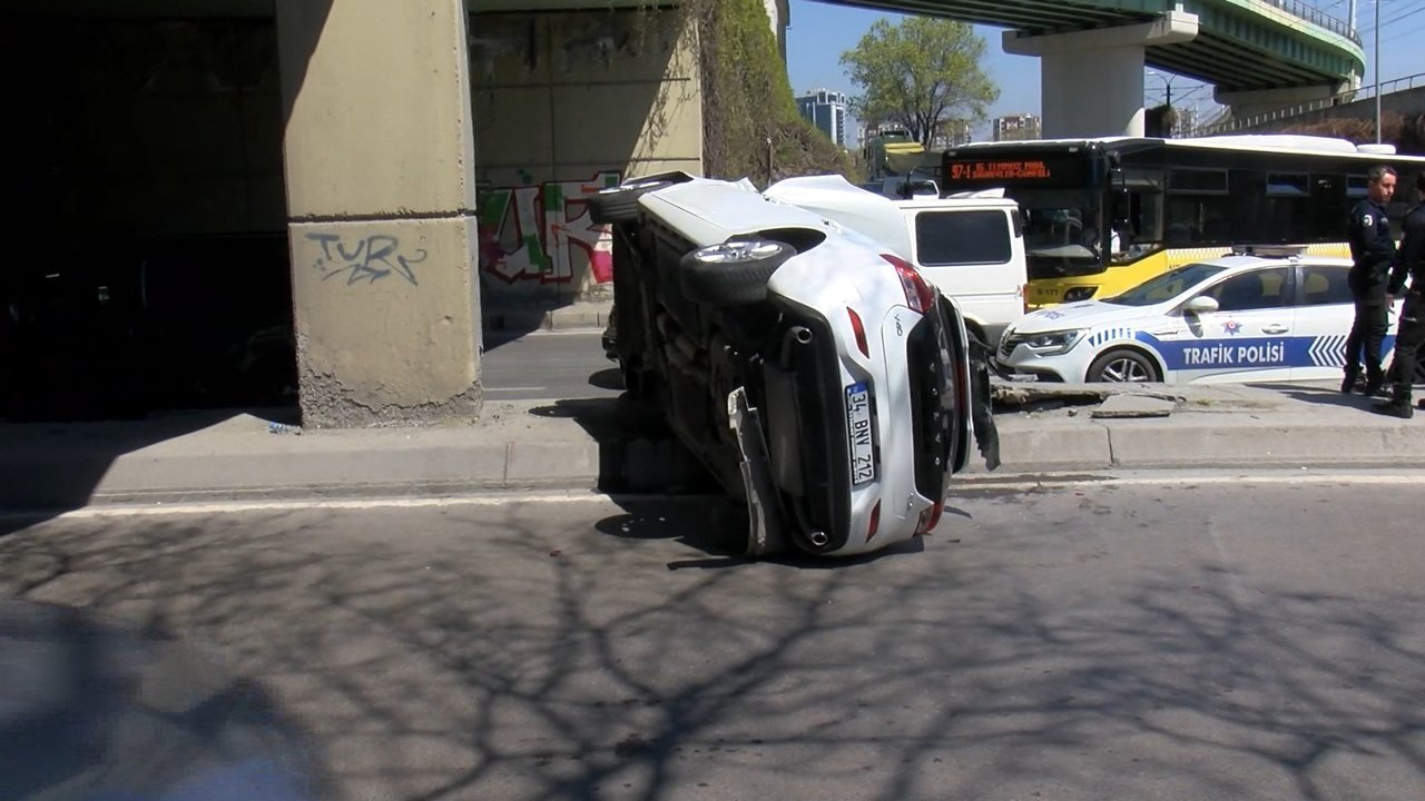 Özgür EREN / İSTANBUL, (DHA) - BAKIRKÖY'de hafif ticari araçla çarpışan otomobil, takla atarak alt geçidin ayağına çarpıp yan durdu. Kazada otomobil sürücüsü yaralanırken, caddede trafik yoğunluğu oluştu.