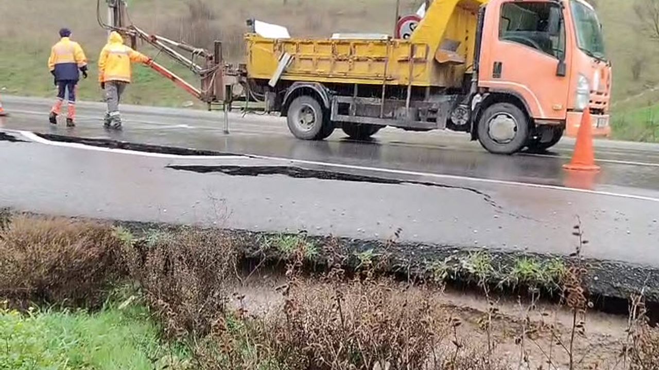 Alper ÇOBANOĞLU/SAVAŞTEPE (Balıkesir), (DHA)-BALIKESİR'in Savaştepe ilçesinde etkili olan sağanağın ardından Balıkesir-Savaştepe kara yolunda, toprak kayması meydana geldi. Yumuşayan asfalt yol, kısmen çöktü.