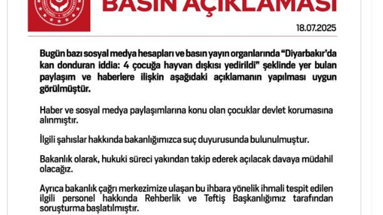 ile ve Sosyal Hizmetler Bakanlığı, 4 çocuğa üvey ağabeyleri tarafından hayvan dışkısı yedirildiği iddiasıyla ilgili açıklama yapıldı. Açıklamada, bazı sosyal medya hesapları ve basın yayın organlarında 'Diyarbakır’da kan donduran iddia: 4 çocuğa hayvan dışkısı yedirildi' şeklinde yer bulan paylaşım ve haberlere ilişkin açıklama yapılması uygun görüldüğü belirtilerek, "Haber ve sosyal medya paylaşımlarına konu olan çocuklar devlet korumasına alınmıştır. İlgili şahıslar hakkında bakanlığımızca suç duyurusunda bulunulmuştur. Bakanlık olarak, hukuki süreci yakından takip ederek açılacak davaya müdahil olacağız. Ayrıca bakanlık çağrı merkezimize ulaşan bu ihbara yönelik ihmali tespit edilen ilgili personel hakkında Rehberlik ve Teftiş Başkanlığımız tarafından soruşturma başlatılmıştır" denildi. (DHA)