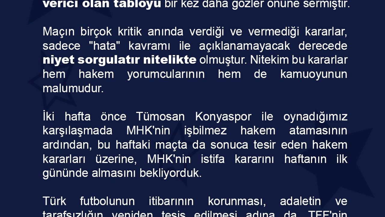 İki hafta önce Tümosan Konyaspor ile oynadığımız karşılaşmada MHK'nin işbilmez hakem atamasının ardından, bu haftaki maçta da sonuca tesir eden hakem kararları üzerine, MHK'nin istifa kararını haftanın ilk gününde almasını bekliyorduk.
