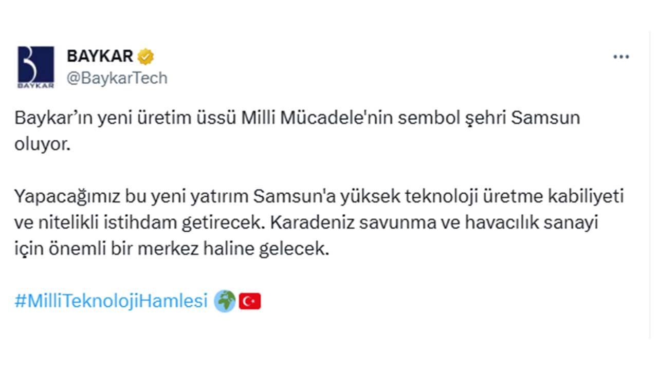 Cumhuriyetin ikinci yüzyılında savunma ve teknoloji yatırımlarının Anadolu’ya yayılması hedefi doğrultusunda Samsun’daki bu yatırım, BAYKAR’ın “Milli Teknoloji Hamlesi” vizyonunun bir parçası olarak değerlendiriliyor.