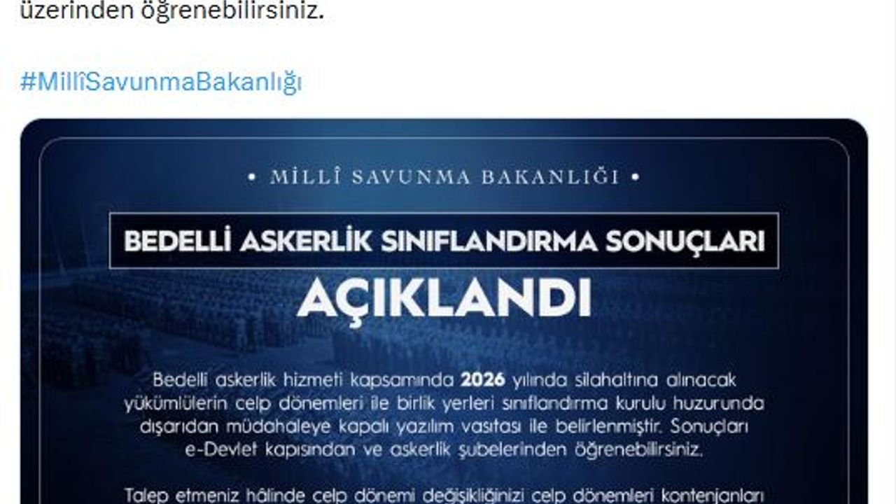 Bakanlığın sanal medya hesabından yapılan açıklamada, 'Bedelli Askerlik Sınıflandırma Sonuçları Açıklandı. Bedelli askerlik hizmeti kapsamında 2026 yılında silahaltına alınacak yükümlülerin celp dönemleri ve birlik yerleri belirlenmiştir. Sonuçlarınızı e-Devlet kapısı, askerlik şubeleri ve MSB Mobil uygulaması üzerinden öğrenebilirsiniz' denildi. (DHA)