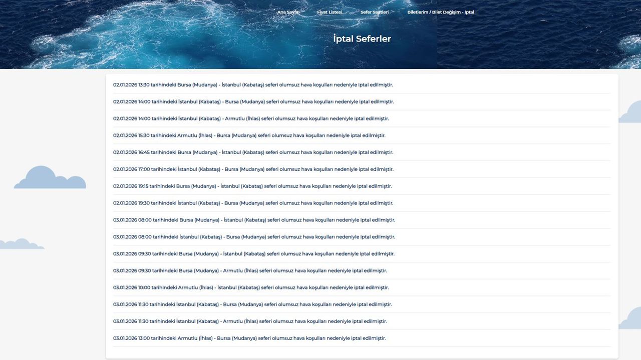 BUDO'nun internet sitesinden yapılan açıklamada, Marmara Denizi'nde etkili olması beklenen şiddetli rüzgar ve dalga boyunun sefer güvenliğini olumsuz etkileyeceği belirtilerek, bazı hatlarda karşılıklı seferlerin gerçekleştirilemeyeceği duyuruldu. Açıklamada, saat 08.00'deki ve 09.30'daki Bursa (Mudanya)-İstanbul (Kabataş), 08.00'deki ve 11.30'daki İstanbul (Kabataş)-Bursa (Mudanya), 09.30'daki Bursa-Armutlu, 10.00'daki Armutlu-İstanbul, 11.30'daki İstanbul-Armutlu ve 13.00'deki Armutlu-Bursa seferleri olumsuz hava koşulları nedeniyle iptal edildiği bildirildi. (DHA)
