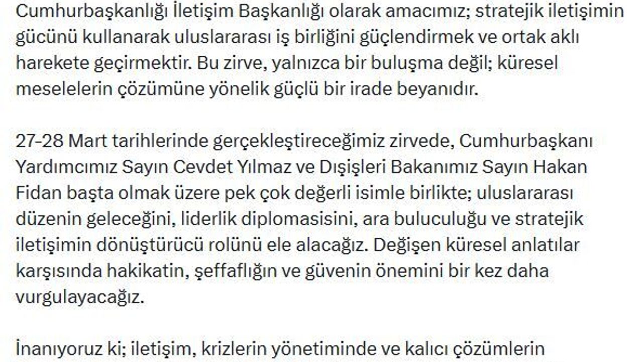 İletişim Başkanı Duran, sanal medya hesabından yaptığı açıklamada, 'Küresel belirsizliklerin arttığı, jeopolitik dengelerin yeniden şekillendiği bir dönemde, STRATCOM Zirvesi vesilesiyle devlet ve hükümet yetkililerini, diplomatları ve uzmanları İstanbul'da bir araya getiriyoruz. Cumhurbaşkanlığı İletişim Başkanlığı olarak amacımız; stratejik iletişimin gücünü kullanarak uluslararası iş birliğini güçlendirmek ve ortak aklı harekete geçirmektir. Bu zirve, yalnızca bir buluşma değil; küresel meselelerin çözümüne yönelik güçlü bir irade beyanıdır. 27-28 Mart tarihlerinde gerçekleştireceğimiz zirvede, Cumhurbaşkanı Yardımcımız Sayın Cevdet Yılmaz ve Dışişleri Bakanımız Sayın Hakan Fidan başta olmak üzere pek çok değerli isimle birlikte; uluslararası düzenin geleceğini, liderlik diplomasisini, ara buluculuğu ve stratejik iletişimin dönüştürücü rolünü ele alacağız. Değişen küresel anlatılar karşısında hakikatin, şeffaflığın ve güvenin önemini bir kez daha vurgulayacağız' ifadelerini kullandı.