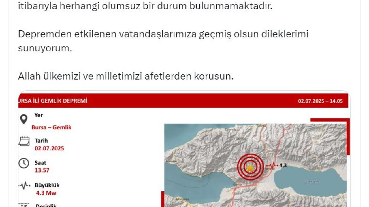 İçişleri Bakanı Ali Yerlikaya, depreme ilişkin sosyal medya hesabından açıklama yaptı. Yerlikaya, "Bursa Gemlik'te 4,3 büyüklüğünde bir deprem meydan gelmiştir. AFAD ve ilgili kurumlarımızın tüm ekipleri saha taramalarına derhal başlamıştır. An itibarıyla herhangi olumsuz bir durum bulunmamaktadır. Depremden etkilenen vatandaşlarımıza geçmiş olsun dileklerimi sunuyorum. Allah ülkemizi ve milletimizi afetlerden korusun" dedi. (DHA)