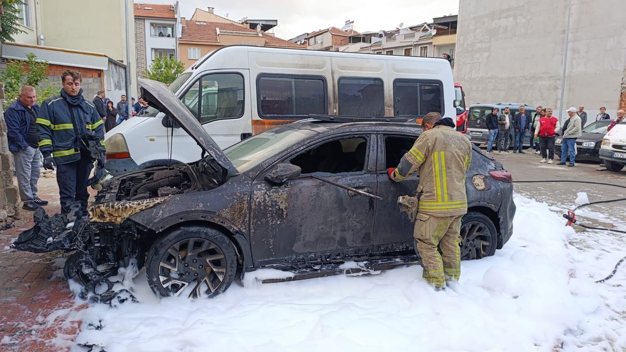 Yavuz YILMAZ/ İNEGÖL(Bursa), (DHA)- BURSA'nın İnegöl ilçesinde park halindeki otomobilde yangın çıktı. Kısa sürede büyüyen yangında otomobil küle dönerken, yanında bulunan cip ile minibüs de zarar gördü.