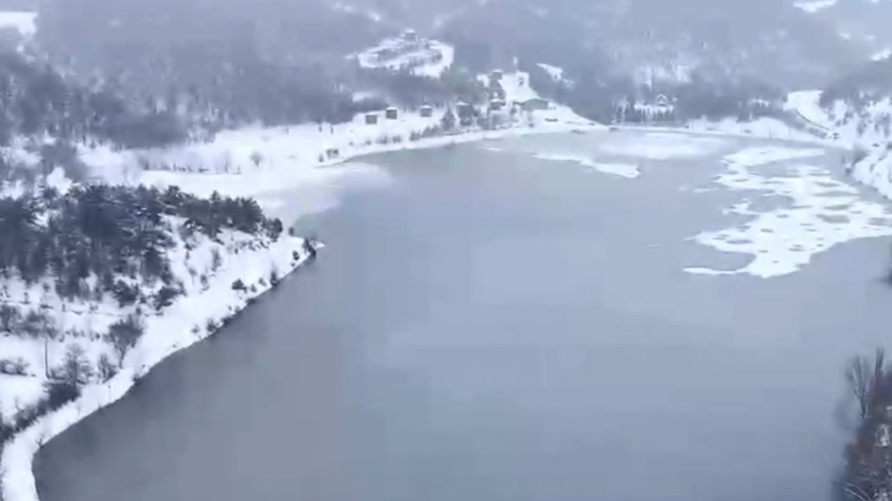 Göynük ilçesine bağlı Çubuk Gölü Tabiat Parkı'nda kar yağışı ve soğuk hava nedeniyle gölün tamamı buzla kaplandı. Buzla kaplanan göl ve çevresindeki karla örtülü alanlar, dronla görüntülendi.