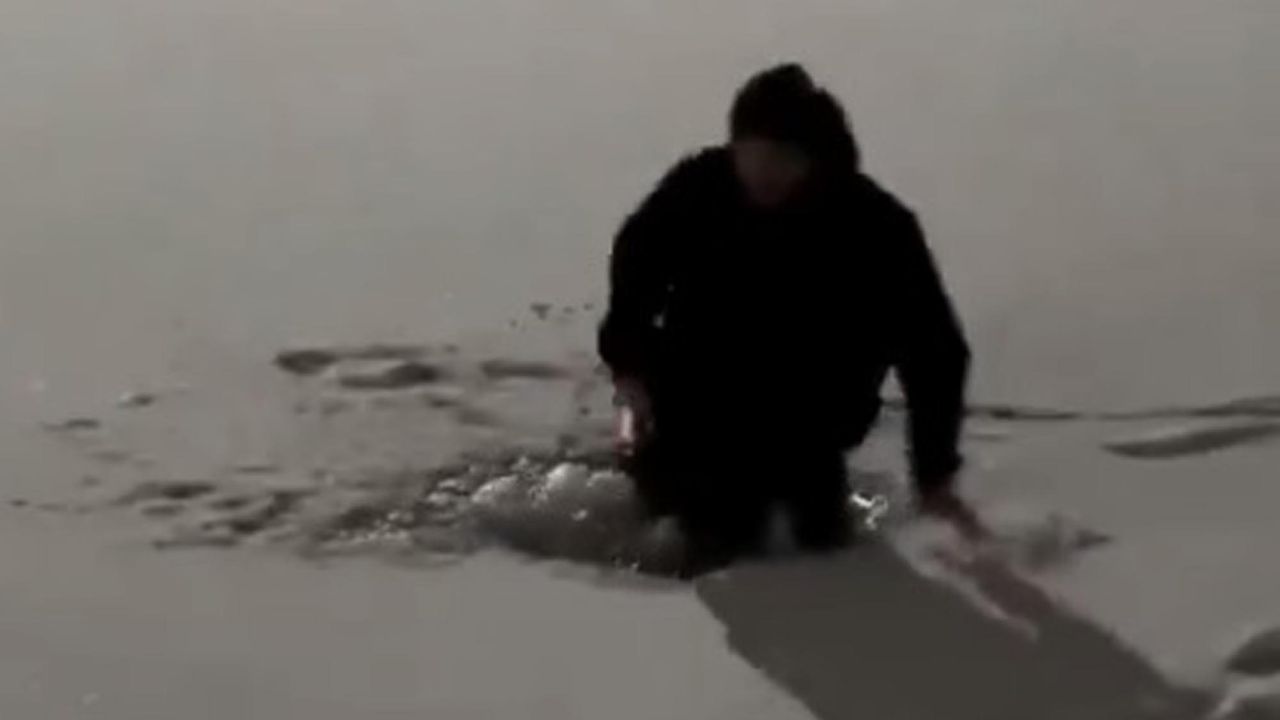 Kar yağışının etkisini kaybetmesinden sonra havaların soğuduğu Muş'ta parklardaki göletlerin yüzeyi buzla kaplandı. Yeşilyurt Mahallesi'nde, yüzeyi donan parkın göletinde yürüyen kişi, bir taraftan da dans etmeye başladı. Bir süre gölette yürüyen kişi, buzun kırılmasıyla suya düştü. Beline kadar suya giren kişinin yaşadıklarını arkadaşı da cep telefonu kamerasıyla görüntüledi. (DHA)