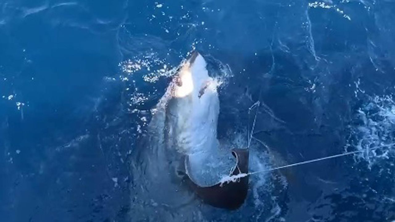 Gökçeada'da balıkçılık yapan İlker Özdemir, bir hafta önce balık avlamak için teknesiyle denize açıldı. Parakete takımlarını denize bırakan Özdemir ve arkadaşları, bir süre sonra takımları toplamaya başladı. Parakete takımını çeken Özdemir, denizde dev bir balık olduğunu gördü. Yüzeye yaklaşan balığın yaklaşık 6 metre uzunluğunda sapan köpek balığı olduğunu fark eden balıkçılar, şaşkınlık yaşadı. Özdemir ve arkadaşları daha sonra balığı oltadan kurtararak tekrar doğal ortamına bıraktı. (DHA)