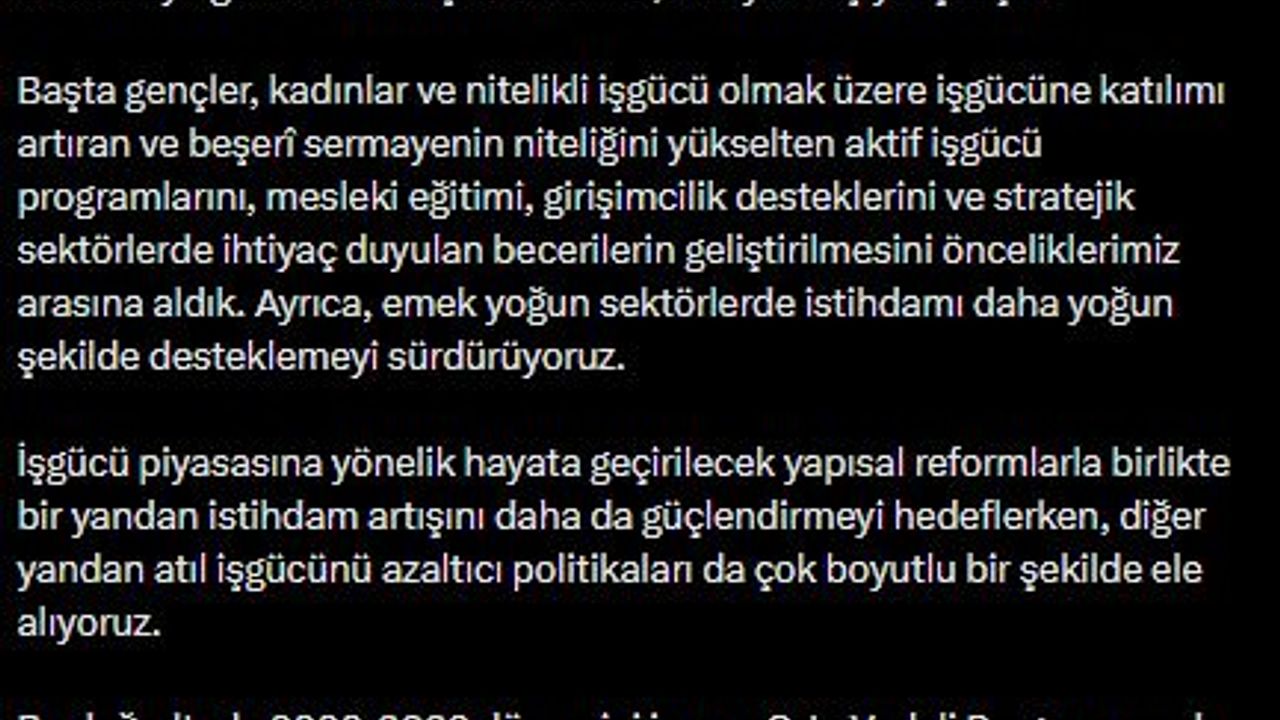 ANKARA, (DHA)- CUMHURBAŞKANI Yardımcısı Cevdet Yılmaz, '2026-2028 dönemini içeren Orta Vadeli Programımızda istihdamın yıllık ortalama 842 bin kişi artmasını, işgücüne katılım oranlarındaki artışa rağmen işsizlik oranının kademeli olarak gerileyerek, 2028 yılında yüzde 7,8 seviyesine ulaşmasını öngörüyoruz' dedi.