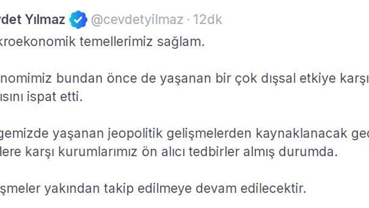 Cevdet Yılmaz, sanal medya hesabından yaptığı açıklamada, 'Makroekonomik temellerimiz sağlam. Ekonomimiz bundan önce de yaşanan birçok dışsal etkiye karşı dirençli yapısını ispat etti. Bölgemizde yaşanan jeopolitik gelişmelerden kaynaklanacak geçici etkilere karşı kurumlarımız ön alıcı tedbirler almış durumda. Gelişmeler yakından takip edilmeye devam edilecektir' dedi.