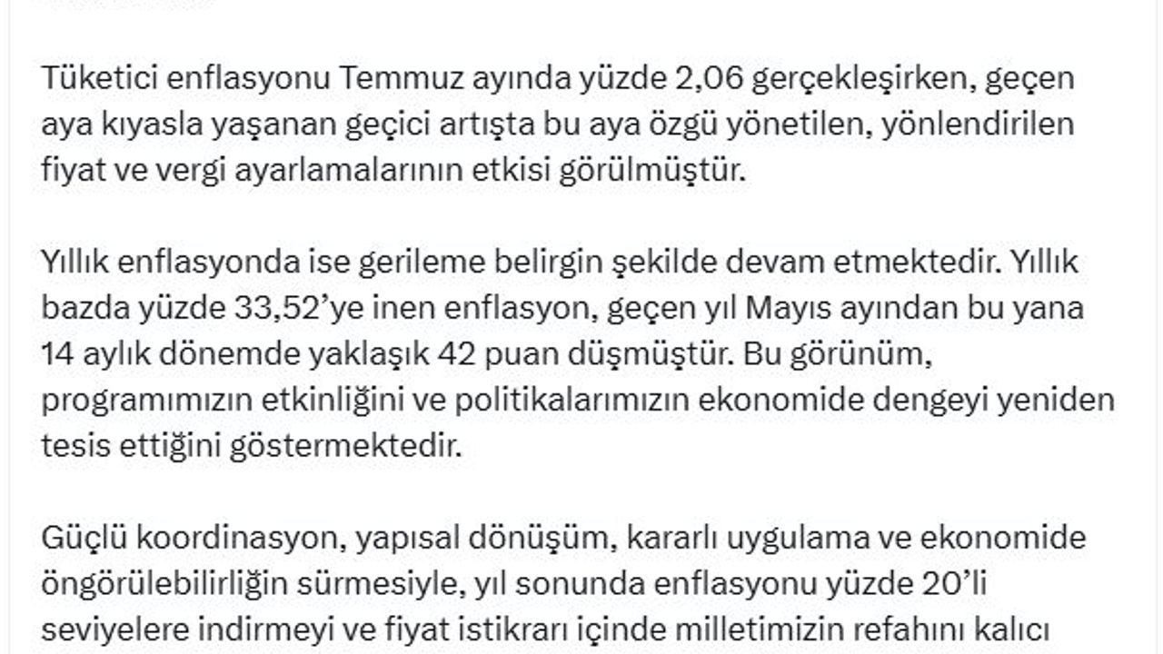 Cumhurbaşkanı Yardımcısı Yılmaz, Türkiye İstatistik Kurumu (TÜİK) tarafından açıklanan Temmuz 2025 dönemine ilişkin tüketici fiyat endeksi verilerini değerlendirdi. Yılmaz, sosyal medya üzerinden yaptığı açıklamada, "Orta Vadeli Programımız çerçevesinde, enflasyonla mücadeleye yönelik kararlı ve koordineli adımlarımız sayesinde enflasyon düşmeye devam etmektedir. Tüketici enflasyonu, temmuz ayında yüzde 2,06 gerçekleşirken, geçen aya kıyasla yaşanan geçici artışta bu aya özgü yönetilen, yönlendirilen fiyat ve vergi ayarlamalarının etkisi görülmüştür" dedi.