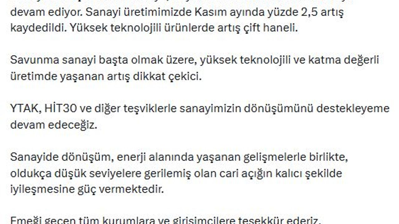 Cumhurbaşkanı Yardımcısı Cevdet Yılmaz, kasım ayı sanayi üretimi istatistiklerine ilişkin sanal medya hesabından açıklama yaptı. Yılmaz, 'Sanayimizin çarkları dönmeye, büyüme ve ihracata katkı sunmaya devam ediyor. Sanayi üretimimizde kasım ayında yüzde 2,5 artış kaydedildi. Yüksek teknolojili ürünlerde artış çift haneli. Savunma sanayi başta olmak üzere, yüksek teknolojili ve katma değerli üretimde yaşanan artış dikkat çekici. YTAK, HİT30 ve diğer teşviklerle sanayimizin dönüşümünü destekleyeme devam edeceğiz. Sanayide dönüşüm, enerji alanında yaşanan gelişmelerle birlikte, oldukça düşük seviyelere gerilemiş olan cari açığın kalıcı şekilde iyileşmesine güç vermektedir. Emeği geçen tüm kurumlara ve girişimcilere teşekkür ederiz' dedi. (DHA)