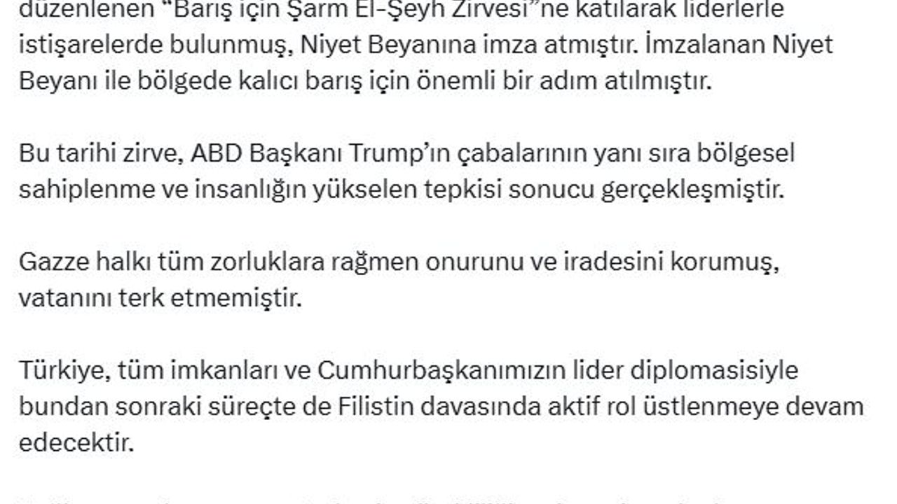 Cumhurbaşkanı Yardımcısı Cevdet Yılmaz, Mısır’ın Şarm El-Şeyh şehrinde düzenlenen ve Gazze’de varılan ateşkes mutabakatına ilişkin olarak toplanan ‘Barış için Şarm El-Şeyh Zirvesi’ne ilişkin sosyal medya hesabından açıklama yaptı. Yılmaz, "Cumhurbaşkanımız Sayın Recep Tayyip Erdoğan, Gazze’deki ateşkesin ardından düzenlenen 'Barış için Şarm El-Şeyh Zirvesi'ne katılarak liderlerle istişarelerde bulunmuş, Niyet Beyanı'na imza atmıştır. İmzalanan Niyet Beyanı ile bölgede kalıcı barış için önemli bir adım atılmıştır. Bu tarihi zirve, ABD Başkanı Trump’ın çabalarının yanı sıra bölgesel sahiplenme ve insanlığın yükselen tepkisi sonucu gerçekleşmiştir. Gazze halkı tüm zorluklara rağmen onurunu ve iradesini korumuş, vatanını terk etmemiştir. Türkiye, tüm imkanları ve Cumhurbaşkanımızın lider diplomasisiyle bundan sonraki süreçte de Filistin davasında aktif rol üstlenmeye devam edecektir. Sağlanan anlaşmanın; ateşkesin sürekliliğine, insani yardımların kesintisiz ulaştırılmasına, Gazze’nin Filistin halkının beklentilerine uygun yeniden imarına vesile olmasını ve kalıcı barış için iki devletli çözümün yolunu açmasını diliyorum" ifadelerini kullandı. (DHA)