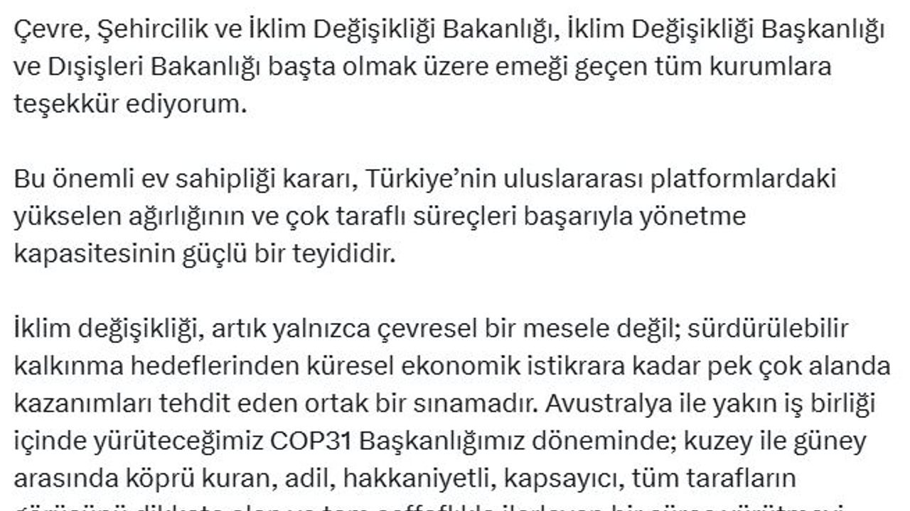 Yılmaz, "İklim değişikliği, artık yalnızca çevresel bir mesele değil; sürdürülebilir kalkınma hedeflerinden küresel ekonomik istikrara kadar pek çok alanda kazanımları tehdit eden ortak bir sınamadır. Avustralya ile yakın iş birliği içinde yürüteceğimiz COP31 Başkanlığımız döneminde; kuzey ile güney arasında köprü kuran, adil, hakkaniyetli, kapsayıcı, tüm tarafların görüşünü dikkate alan ve tam şeffaflıkla ilerleyen bir süreç yürütmeyi amaçlıyoruz. Cumhurbaşkanımız Sayın Recep Tayyip Erdoğan’ın ortaya koyduğu 2053 Net Sıfır Emisyon hedefi doğrultusunda, sürdürülebilirlik ve yeşil dönüşüm çalışmalarımızı kalkınma politikalarımızın merkezine yerleştirdik. Yenilenebilir enerjiye yaptığımız yatırımlar sayesinde, bu alanın toplam kurulu güç içindeki payını yüzde 60’ın üzerine çıkarmış bulunuyoruz. Bu yıl yasalaştırdığımız İklim Kanunu ile dönüşüm sürecimizi daha da hızlandırırken; enerji verimliliği, temiz ulaşım, döngüsel ekonomi ve Sayın Emine Erdoğan Hanımefendi’nin himayesinde başarılı bir şekilde yürüttüğümüz Sıfır Atık gibi pek çok alanda somut adımlar atmaya devam ediyoruz. Son yıllarda Sayın Cumhurbaşkanımızın liderliğinde yürüttüğümüz diplomatik girişimlerle Türkiye, küresel ölçekte yapıcı ve belirleyici bir aktör haline gelmiştir. Önümüzdeki yıl ülkemizde gerçekleştirilecek NATO Zirvesi ile birlikte COP31’e ev sahipliği yapacak olmamız, Türkiye’nin uluslararası iş birliğine ve küresel yönetişime sunduğu katkıyı daha da güçlendirecektir. COP31 Başkanlığı ve ev sahipliğimizin; küresel iklim müzakerelerine yeni bir ivme kazandıran, ülkeler arası dayanışmayı güçlendiren ve sürdürülebilir kalkınma hedeflerine somut katkılar sunan hayırlı sonuçlara vesile olmasını diliyorum" açıklamasında bulundu. (DHA)