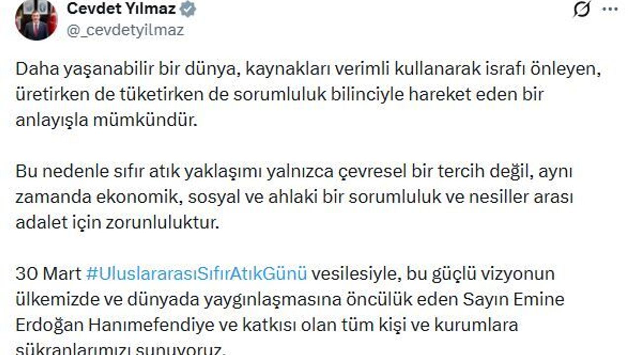 Cumhurbaşkanı Yardımcısı Cevdet Yılmaz, sanal medya hesabından paylaştığı mesajda, 'Daha yaşanabilir bir dünya, kaynakları verimli kullanarak israfı önleyen, üretirken de tüketirken de sorumluluk bilinciyle hareket eden bir anlayışla mümkündür. Bu nedenle Sıfır Atık yaklaşımı yalnızca çevresel bir tercih değil, aynı zamanda ekonomik, sosyal ve ahlaki bir sorumluluk ve nesiller arası adalet için zorunluluktur. 30 Mart Uluslararası Sıfır Atık Günü vesilesiyle, bu güçlü vizyonun ülkemizde ve dünyada yaygınlaşmasına öncülük eden Sayın Emine Erdoğan Hanımefendi'ye ve katkısı olan tüm kişi ve kurumlara şükranlarımızı sunuyoruz' dedi. (DHA)