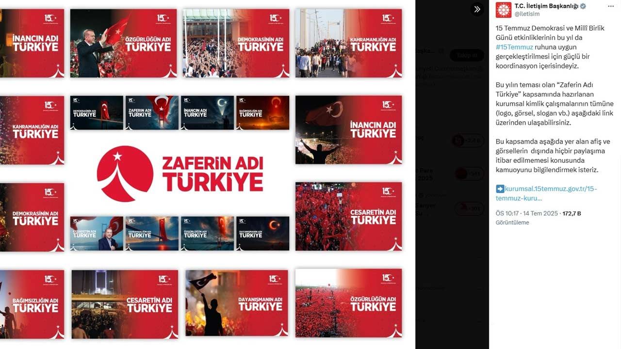 “İletişim Başkanlığı, 15 Temmuz Demokrasi ve Milli Birlik Günü kapsamında yayınladığı belgeyle etkinliklerin temasını, sloganlarını ve görsellerini belirlemiş, tüm kurumlara iletmiştir. Bu sloganlar arasında ‘Milletin Adı Türkiye’ de bulunmaktadır.”